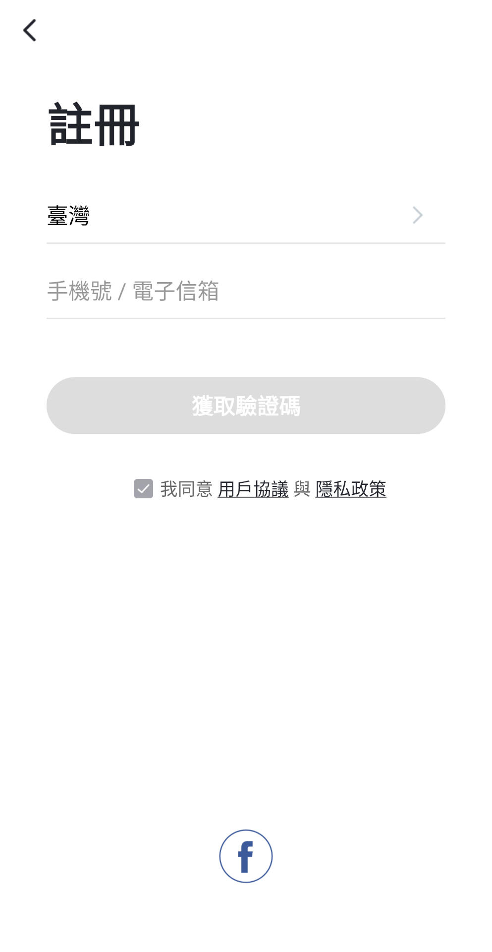點擊"註冊"按鈕後,可選擇電子信箱、手機號碼或 Facebook 帳號進行註冊。