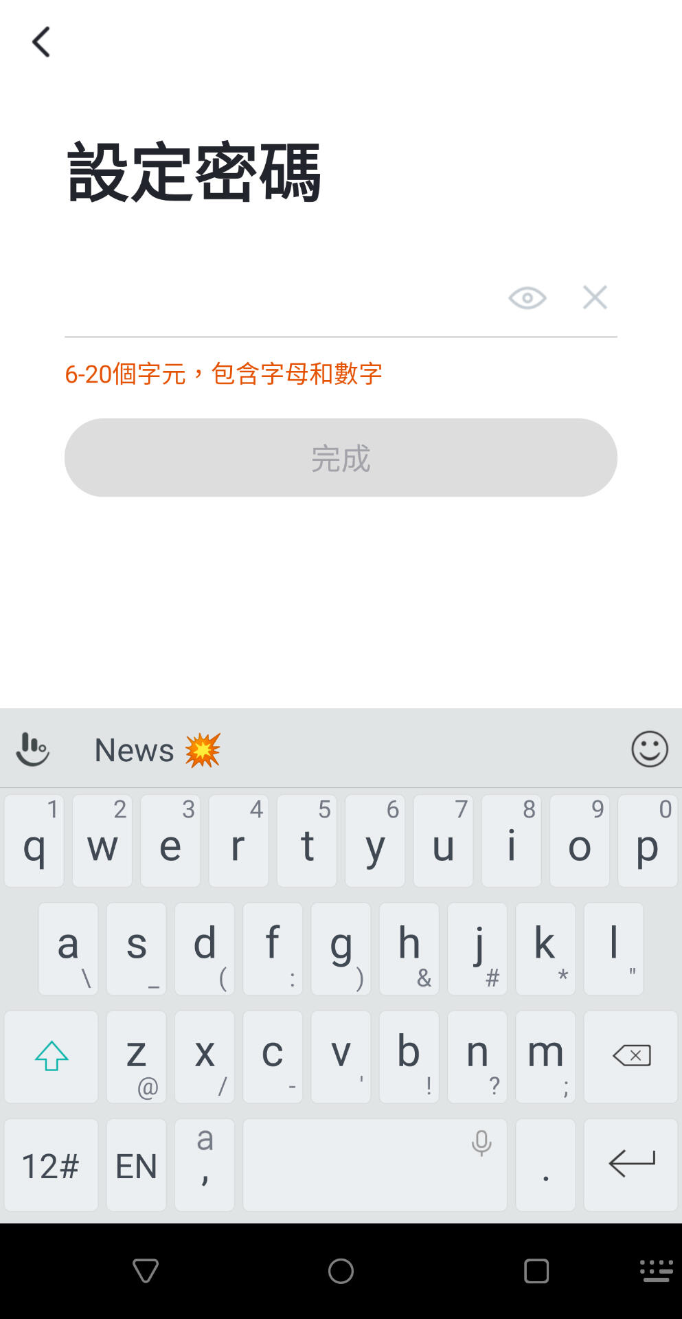 輸入驗證碼後,進入設定密碼畫面,設定6-20個字元密碼 (包含字母跟數字)。