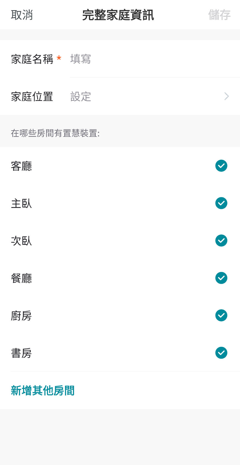 點擊進入"我的家",進入"完整家庭資訊"設定頁面,設定"家庭名稱"與"家庭位置"。