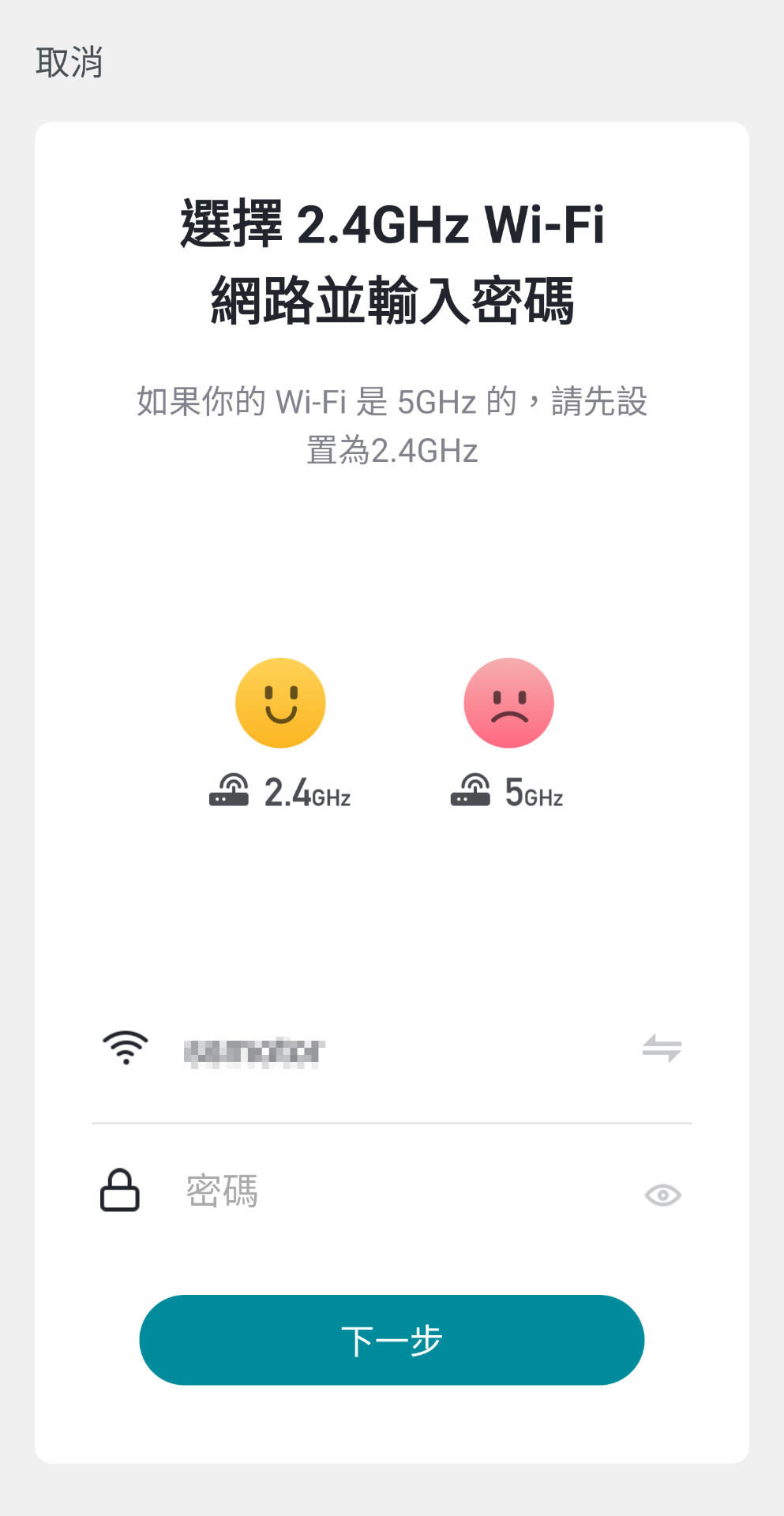 進入Wi-Fi密碼設定頁面,輸入家中Wi-Fi帳號、密碼後,開始自動搜尋裝置。