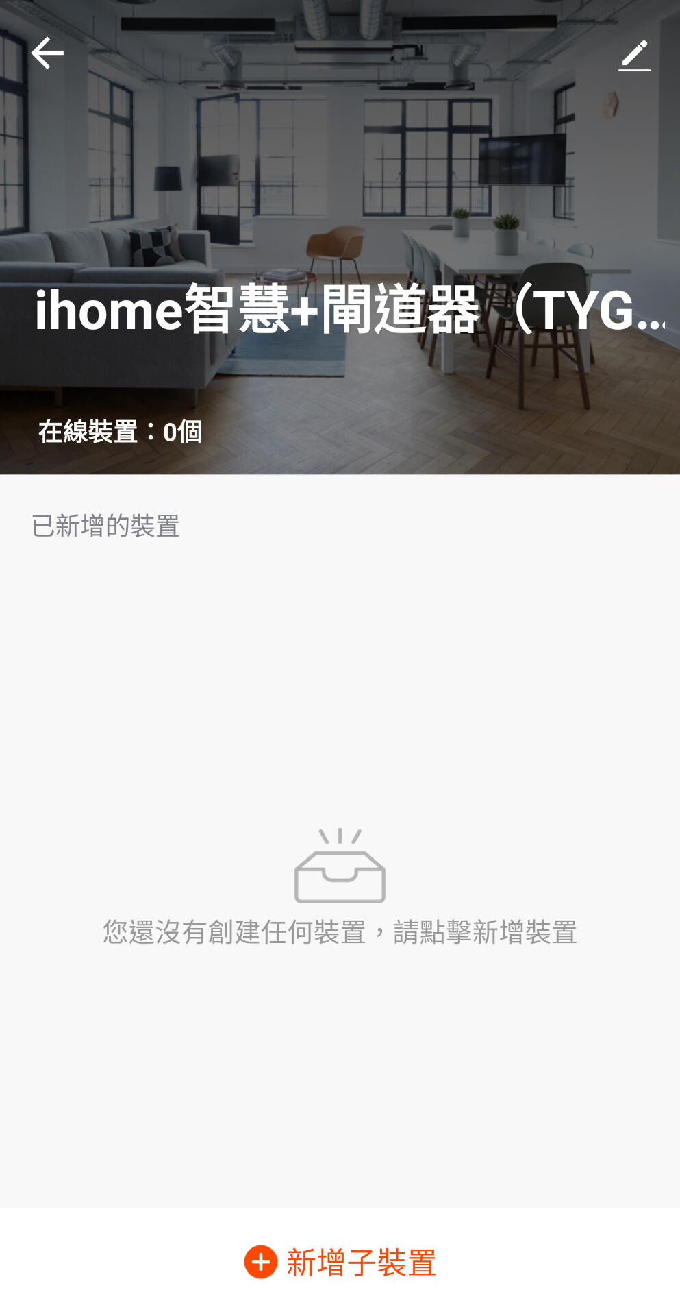 搜尋到ihome智慧+閘道器後,點擊閘道器圖示,進入編輯設定介面,點擊右上"筆"圖示,可修改閘道器名稱,點擊下方"+新增子裝置"。